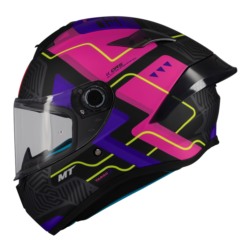 • MT-QVSS – Quick Visor Swap System – sistem proiectat intern de echipa de ingineri MT si echipat in premiera pe casca Targo S;