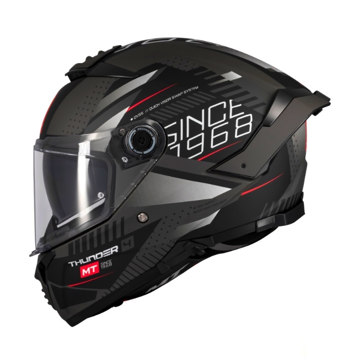 • MT-QVSS – Quick Visor Swap System – sistem proiectat intern de echipa de ingineri MT si echipat in premiera pe casca Thunder 4 SV;
