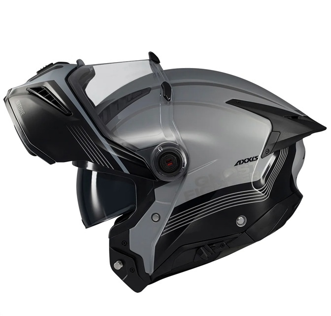 – este un model de casca flip-up care cu siguranta va atrage priviri si care incorporeaza noul mecanism de viziera tip MT-QVSS, un sistem patentat de Axxis si care permite shimbarea extrem de rapida a vizierei;